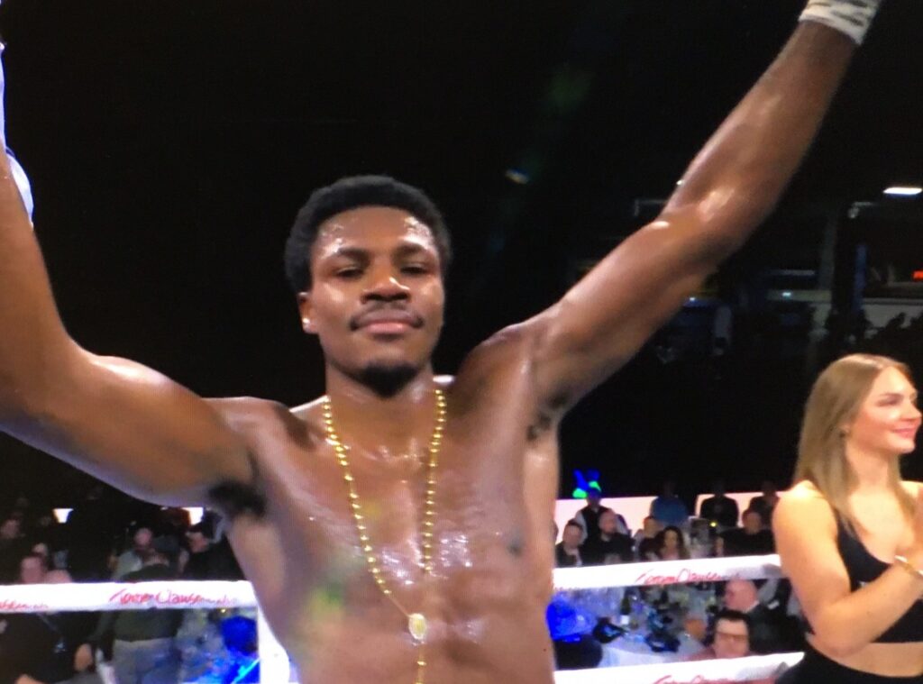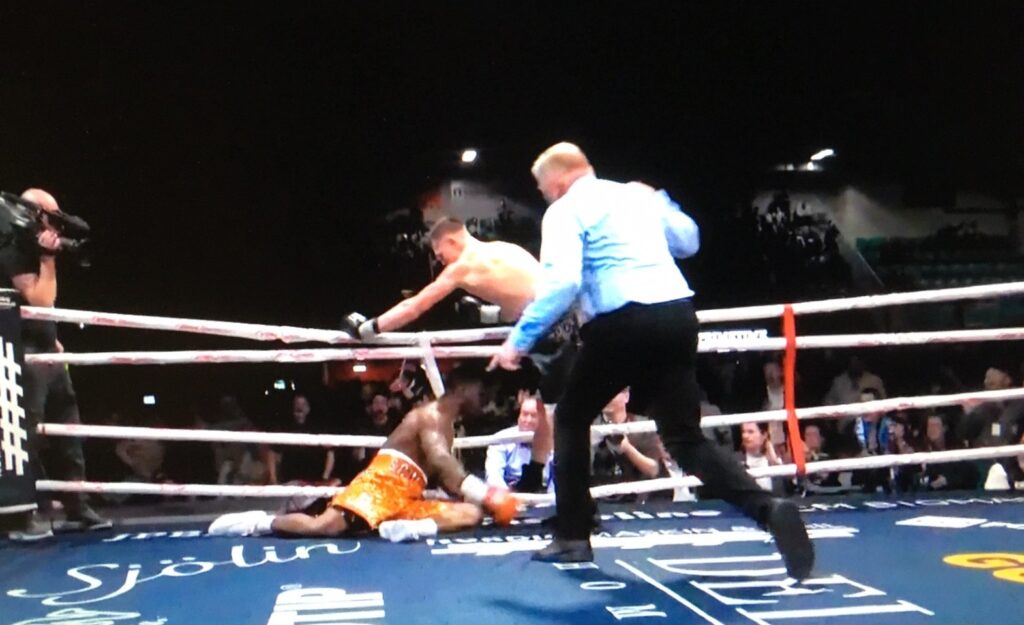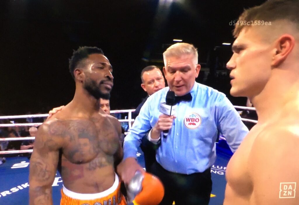 Denna match, liksom resten av galan, gick ut över DAZN:sTV-sändning, och via denna kunde man väl förstå att det var en utmärkt stämning i den utsålda arenan, där det uppenbart var fest och högt i tak, både vid dinner boxing borden och på läktarna, men TV-sändningen i sig led länge av obegripligt långa longörer (15-20+ minuter av ’ingenting’/en tom ring) mellan varje match. Och några av matcherna blev debacle. Allt inleddes av en miserabel tungviktskamp, där kubanen Cardillo puttade omkull en överfet italienare, som då inte orkade resa sig. Melissa Mortensen (9-0) vann sedan en skaplig 8 ronders match i superbantam över Tori-Ellis Willets(7-2); hemmafavoriten Maher Khatib (nu 4-1) fick så klart stryk av skickligt kontra/attack-boxande italienaren Pasquale Basile (13-4) i en 8:a i lätt weltervikt; därefter kom Nangas fight – och sen, efter ännu en longör, kom ett tänkt 8-rondersmöte i supermellan med hemmaboxaren Oliver Zaren(19-0) mot inhämtade argentinaren David Benitez (13-11). Den matchen avgjordes på ett rent bisarrt domslut (”only in Denmark”) där dansken i en låst situation vid repen drämde in ett slag direkt i nacken på Benitez, varpå denne handlöst stöp livlös i golvet – och blev sedan där liggande i fem minuter (!).. utan att någon i saklig mening brydde sig ett skvatt om den livlösa människan (inte ens hans egna sekonder!) och det danska gänget gick hånflinande omkring och slog ut med händerna .. ringdomare Christensen bestämde på stående fot att Benitez ”spelade pajas” – och domslutet fastslogs till helt omöjliga ”dansk seger på knockout”..!! Milde himmel.