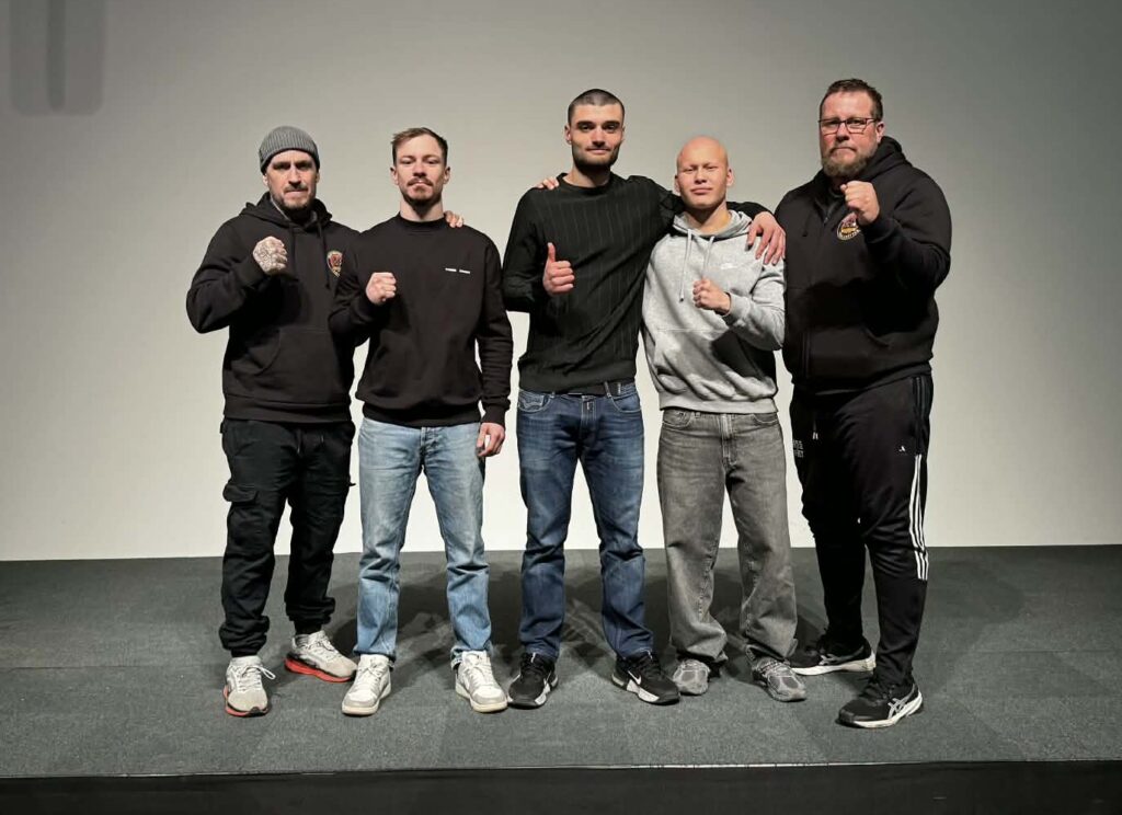 Det är nu dryga fjorton dagar kvar till Skoftebyn AIS Jubileumsgala med Warriors proffs-show som avslutning – det evenemang som är inbokat till Nova Arena & Konferenscenter i Trollhättan den 28/3. På bilden ovan ser ni några av huvudpersonerna i sammanhanget, från vänster chefstränare Tobias Myrström, debuterande proffset Peter Ahlberg, dito proffsdebutanter Ardi Hajra och Marco Alärd samt längst till höger bossen själv och promotorn Mika Moisio – hela gänget var på inspektionstur i Nova och kollade lokal med scen, där det hela skall äga rum.