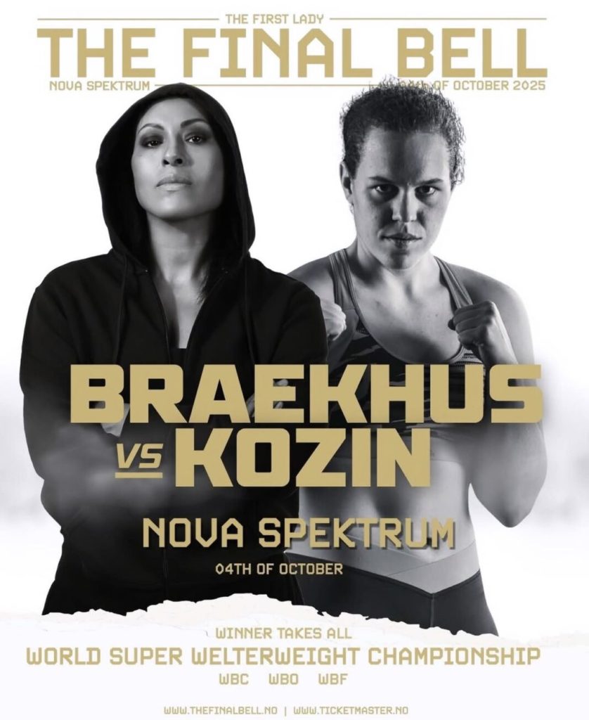 Boxningens ”First Lady” Cecilia Braekhus (38-2-1/9 KO) går sin sista fight till mötes, då hon nu på lördag den 4/10 i Nova Spektrum i Lilleström i Norge tar sig an WBO/WBC-VM-drottningen Ema ”The Princess” Kozin (24-1-1/12 KO) i den fight som döpts till ”The Final Bell”. Här tar nämligen den redan legendariska Braekhus – VM i weltervikt 2009-20, numera WBC/Interim Champ – farväl till en 19 år lång proffskarriär. Så är det i vart fall tänkt. Kampen mot Kozin blir hennes 31:a VM-match! Hon har vunnit 27 gånger med en VM-titel på spel. 44 år gammal har hon nu bestämt att det är nog. Kozin, från Slovenien och blott 26 år gammal, gör sitt första försvar av WBC/WBO-titlarna, men har tidigare hållit WIBF/WBF-VM. First Lady Promotions (CB:s eget bolag) arrangerar detta ’stevne’ där VM-kampen är given topp, på ett i övrigt med fem förmatcher tungt program. UFC Fight Pass TV-sänder.