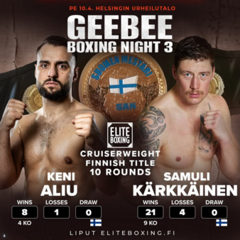 Det är fight week i Finland för en av vårens tuffare tävlingar i östra broderlandet, nämligen ’GeeBee Boxing Night’ nu redan på fredag i Helsingfors Urheilotaalo/idrottshall i regi EliteBoxing. Huvudmatch på programmet är ett prestigeladdat möte över 10 ronder om det vakanta finska mästerskapet i cruiservikt mellan Keni ”Kylien Kingi” Aliu (8-1) och Samuli Kärkkäinen (21-4).