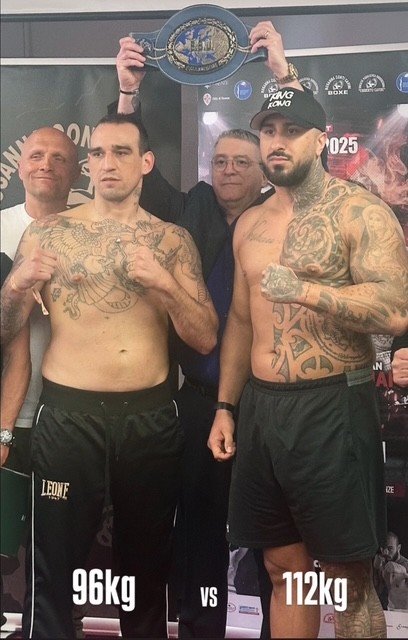 Italienske tungviktskungen Eduardo Giustini vägde in på 96 kg, medan den svenske tungviktskungen Pezhman Seifkhani vägde in på häftiga (trimmade) 112 kg ..! Det blir 16 kg plus för den store örebroaren inför morgondagens drabbning i Palazzo Wanny i Florens, Italien .. i Giustinis egen hemma-arena, där allt då handlar om EBU/Silver-titeln i tungvikt .. det näst finaste EM-bälte som existerar .. ett första kval in till stora Europa-titeln. Vi har fått några bilder från invägningen nu på tisdagskvällen. På ”face off” bilden ses Giustini t v och Pezhman t h med bältet lyftat bakom sig.