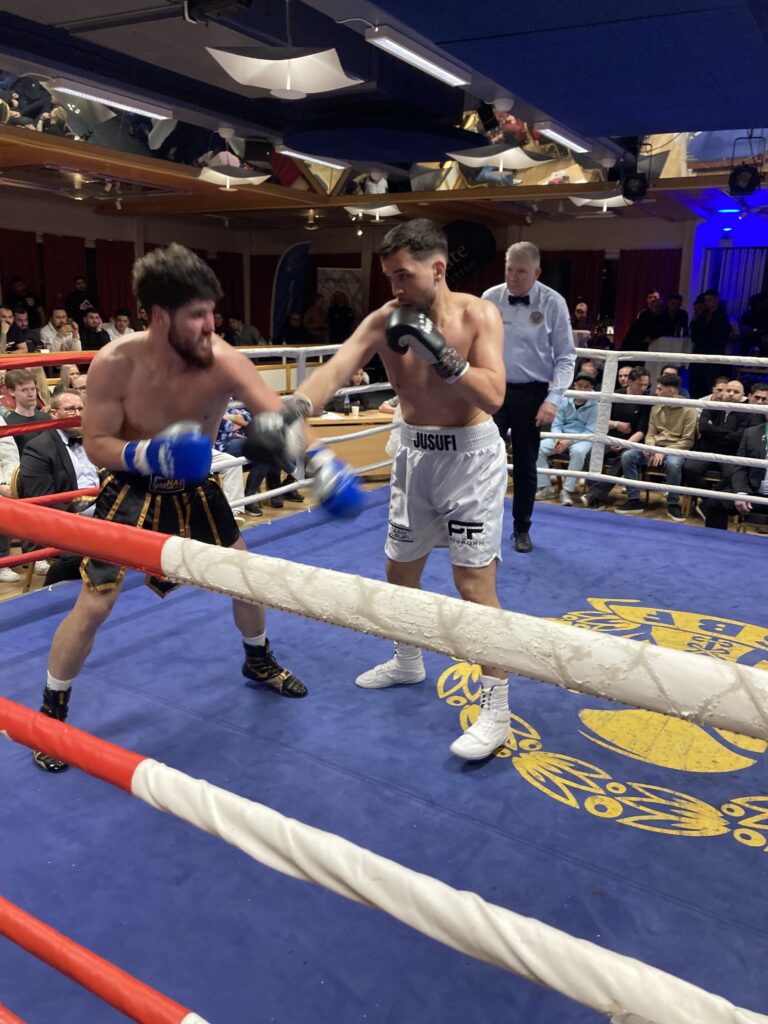 I tredje proffsmatchen tog Malmös Ajet Jusufi (4-0/2KO) hem en fin seger över tufft fightande georgiern Merab Tchintcharauli (1-4) då sekonden helt enkelt vägrade lämna ringhörnan, och domare Höök därmed dömde ut TKO4 över den uppgivne utlänningen. Då hade emellertid Merab startat starkt med att vinna första ronden, varefter dock Jusufi boxade upp sig i de två följande ronderna till ett klart övertag.