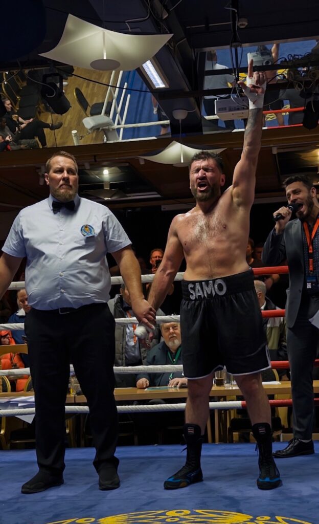 Estländaren vann första och tredje ronderna och gjorde andra jämn, varför det tog Samo fjärde, femte och sjätte ronderna att jämna ut och ta över…och allt starkare forcerade han sedan i sjunde och åttonde ronderna till en trots allt hyggligt klar seger, medan publiken unisont skanderade ”Samo, Samo, Samo” så att det dånade i den lilla utmärkt fina boxningsarenan. Till sist skrevs domarsiffrorna till 78-74, 79-73, 77-75 enhälligt till Jangirov. Och under ett vilt jubel kröntes han ”still Baltic Boxing Union Champion”! Med bälte och allt, och sedan hyllad av en mängd människor i ringen! Det var helt klart en hett efterlängtad revansch, och han tackade varmt både familj, vänner, sekonder och publik i ett fint tal från ringen. Riktigt vackert! 2