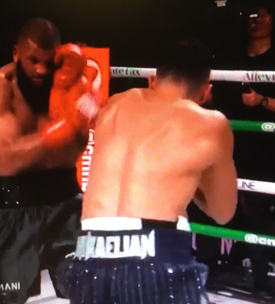 Mikaelian jobbade mycket starkt bak sin fina jabb och hade några bra kroppsträffar tidigt; Badoustod för de enskilt bättre slagen, men oftast grävde sig båda in på absolut närkamp, där de ’tog ut’ varandras boxning. Men i sjunde ronden, efter nytt gruff, då Cantu tidigare varnat Mikaelian för nackslag, stoppade domaren action – och och tog ifrån Noel 1 poäng för ’ruff’. Tungt! I detta läge ledde Jack på poäng. Men i åttonde, efter att Cantu på nytt dragit isär dem från en ful närkamp, gav Badou utmanaren en eftersläng! Och omedelbart stoppade domaren action, och tog nu 1 poäng från Jack! Efteråt brakade de ihop, efter att gonggongen gått, och ett vilt tumult utbröt i ringen, där säkerhetsvakter fick storma in och stoppa teamen från att drabba samman! Det var snudd på kaos innan ordning kunde återbringas..!