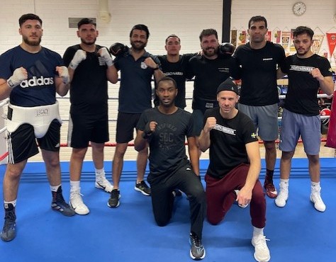 – och gått hård sparring med bjässarna Murat Temirov (21-årig tungviktare) och Patrik Samba (23-årig cruiserviktare), som båda går i proffsplaner framåt, och omger Jangirov på fotot.På gruppbilden från KBK:s lokal ses fr v Murat Temirov, amatör/tungviktare Ahmed Taha, promotor Judi Othman, i mitten Neo Vis Jamegar – som går ena proffsmatchen 21/2 – Samo, Agit Bilge, som hjälpt mycket med sparring, amatören Alvin Shafku – som boxar i J-landslaget vs NOR – och på knä Abdi Fara, som också boxar amatör 21/2 och tränaren Tobias Lantin. Neo Vis Jamegar går ena förmatchen på proffsprogrammet, där de andra hemma-boxarna blir DIF:s mästerfighter Erick Mendoza, Alingsås Kamkian ”DJ” Djiminger och från Malmö inhämtade Ajet Jusufi. Vi återkommer med deras motståndare och matchinfo inom kort. Vi tackar Judi Othman för bildkollaget.