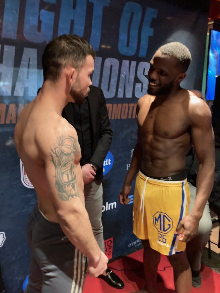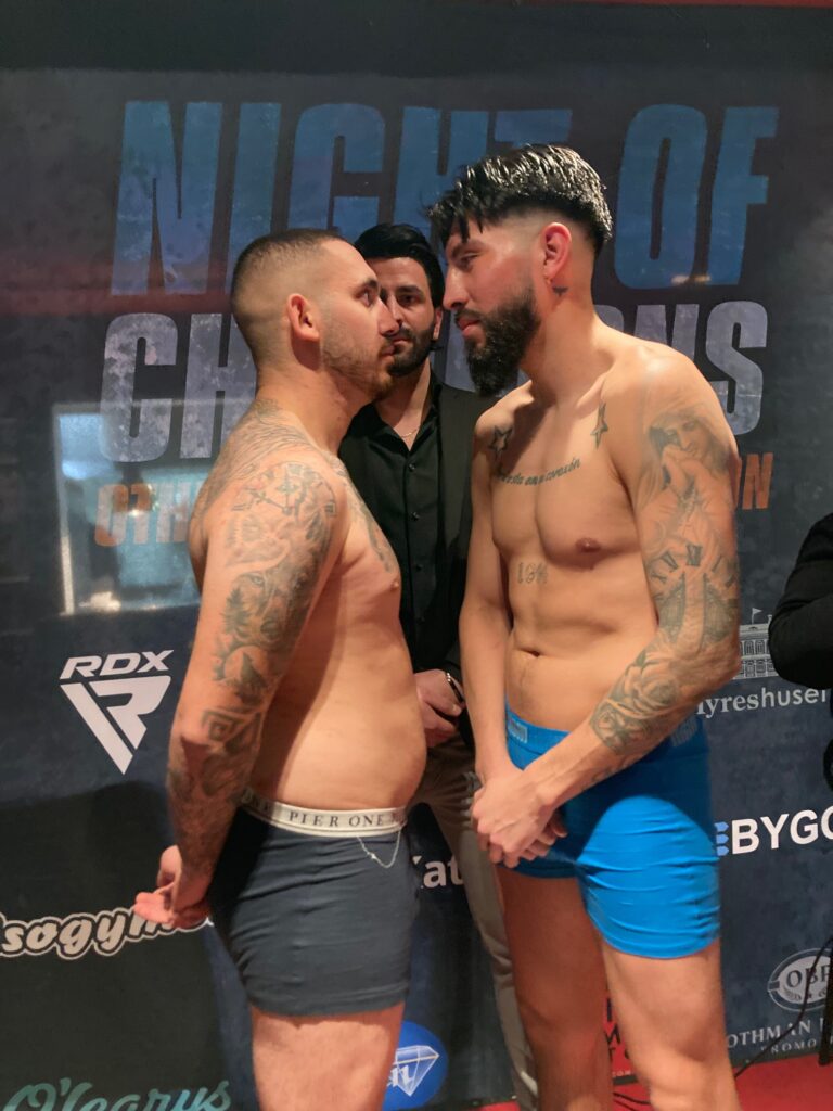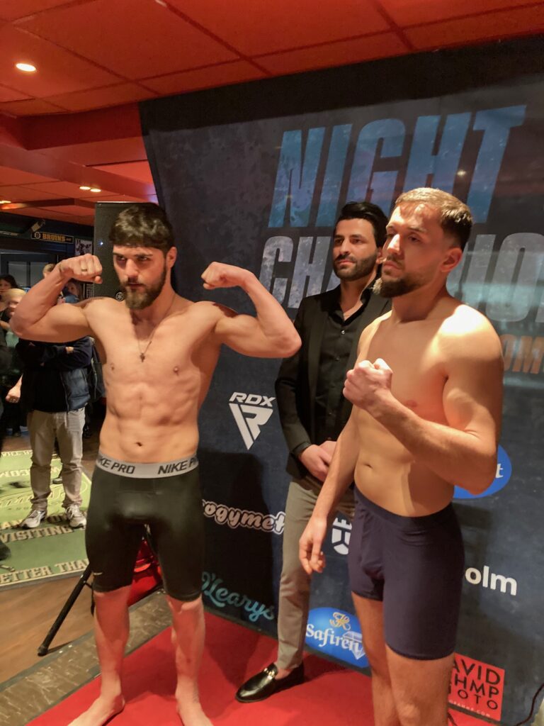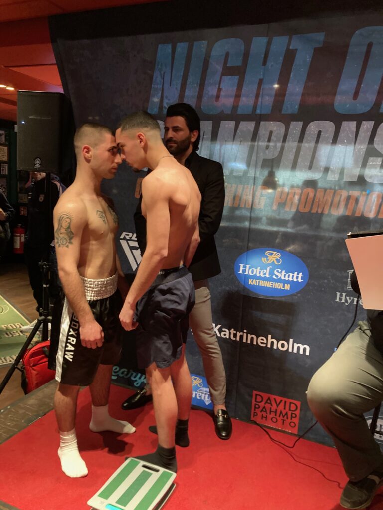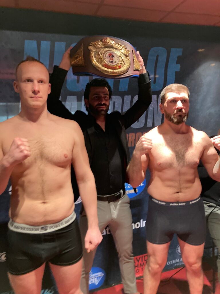 På fredagskvällen hölls invägning av proffsboxningsgänget inför lördagens ”Night of Champions 4” på O’Learys i Katrineholm. Störst publikt bifall och ovationer gavs naturligt nog kvällens huvudkämpar Samo Jangirov och Madis Hiiet som skall göra upp om Baltic Boxing Union (BBU) titel i cruiservikt över 8 ronder. De möttes på podiet i en intensiv staredown följd av ett handskakning och posering inför fotograferna.