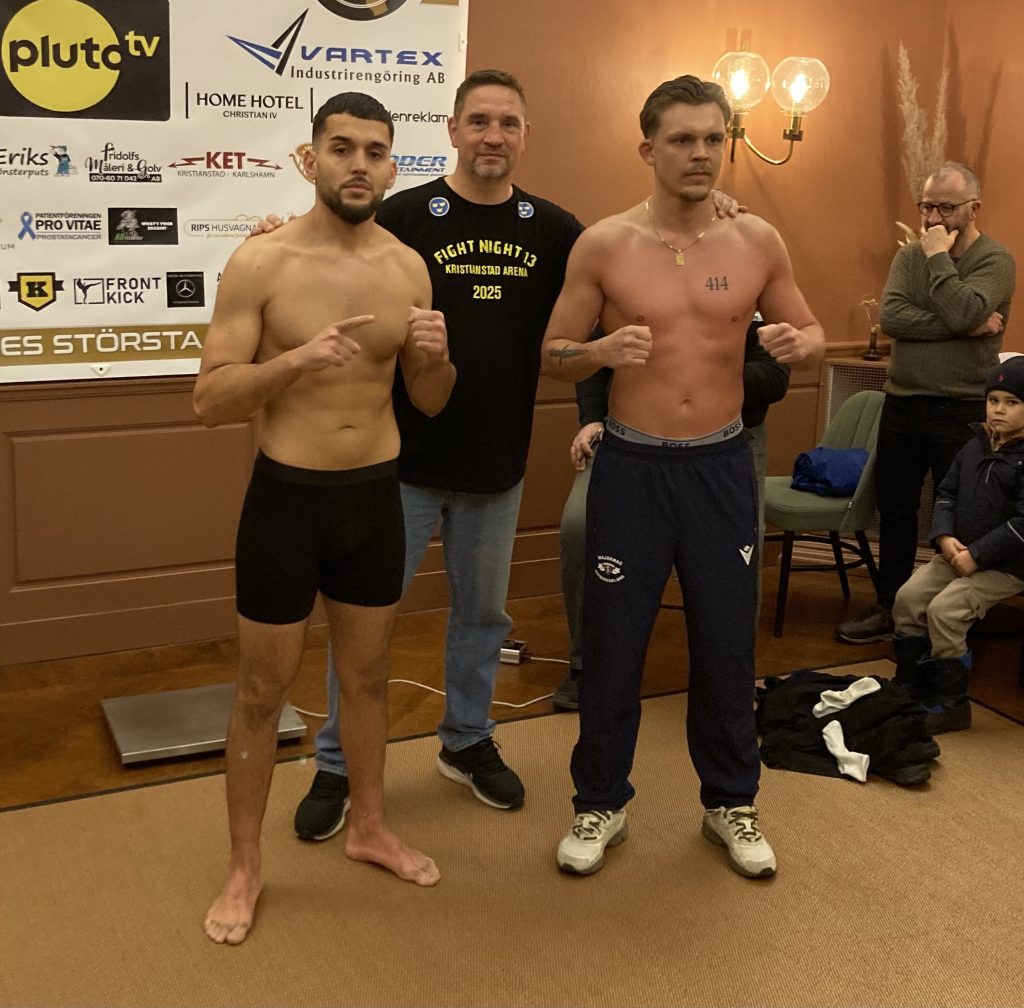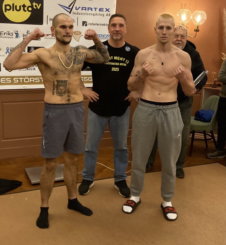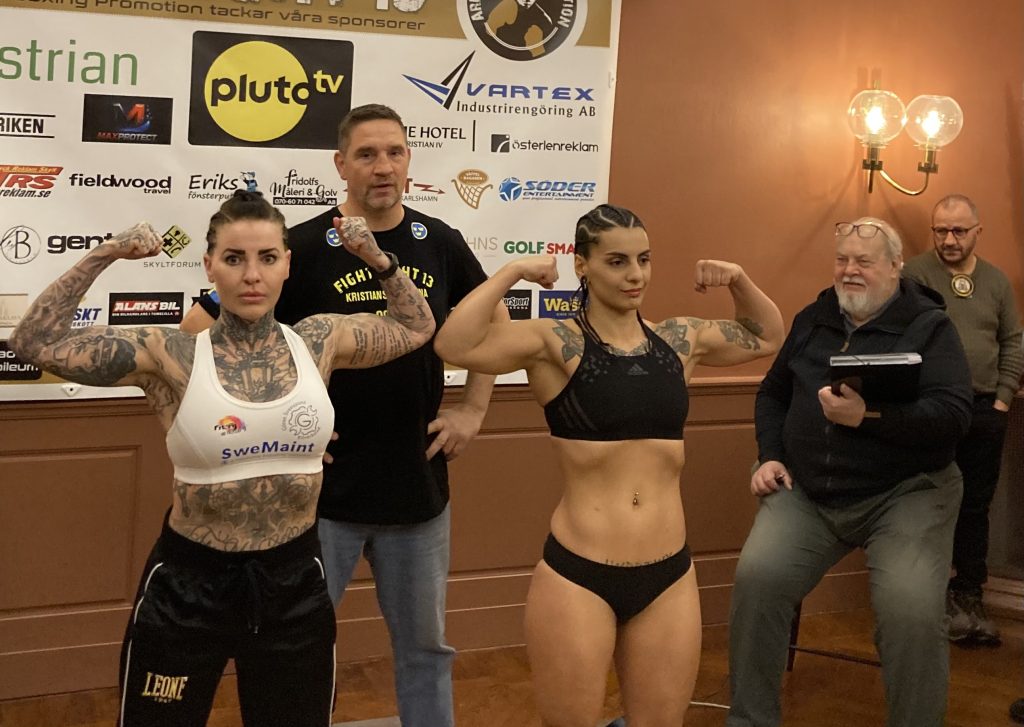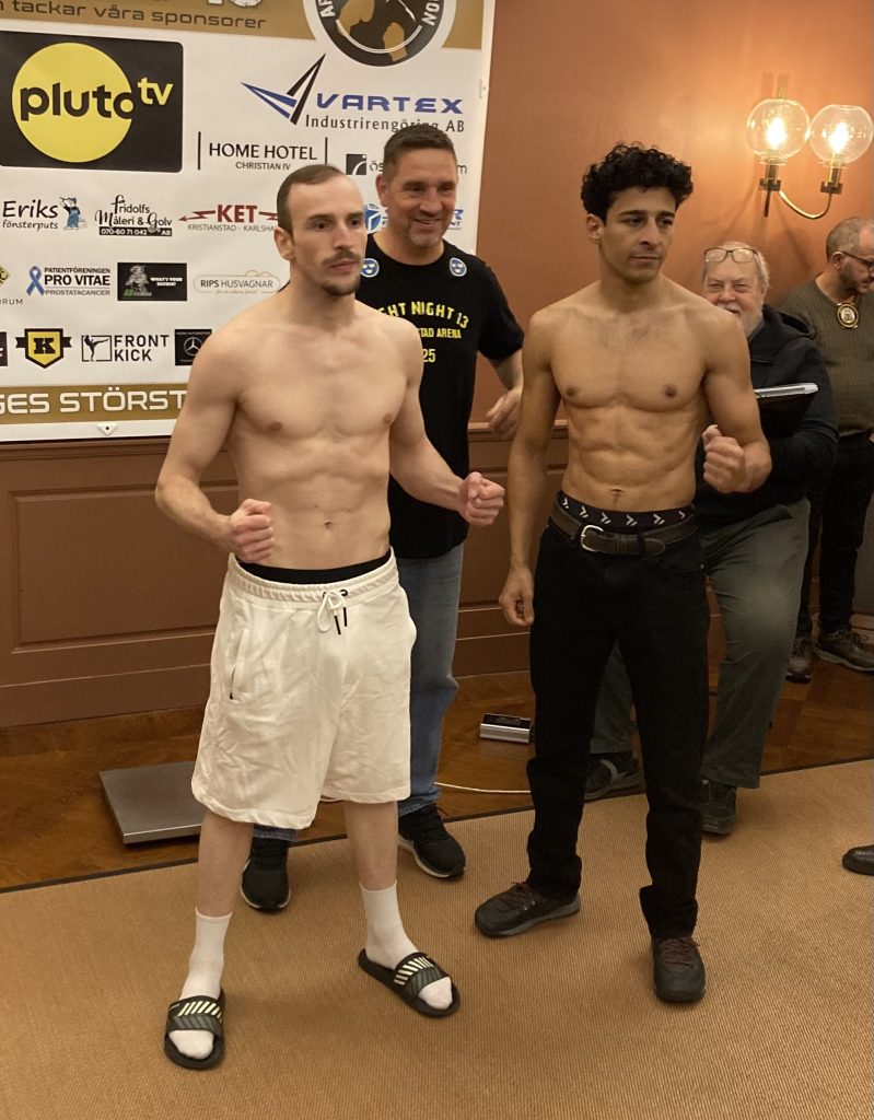Vid fredagens invägning i Hotel Home Christian IV I Kristianstad vägde samtliga tjugo proffsboxare parvis i match efter match in utan problem, varpå de läkarundersöktes och befanns fit for fight – varmed allt nu är ”go” inför lördagens boxningar i Kristianstads arena. Den största skillnaden i vikt uppstod i debuterande Therese Rosells kamp mot tre matcher rutinerade Georgien-proffset Nino Revia. Matchen var satt till lätt weltervikt, men Therese kom in lätt, på blott 61 kg, medan den långväga gästen Nino – efter en försenad flygresa i snöoväder- kom in för tung, på 64 kg, men den tuffa göteborgskan godtog detta och accepterade att fightas trots vikthandikapp. I de flesta av de andra matcherna vägde dock det stora flertalet kämpar tämligen jämnt. I huvudmatchen, damernas titeljakt (WBA/Gold-bältet) i flugvikt kom svensk-australiensiska Linn Sandström och förra VM-drottningen Maribel Ramirez upp på vågen med blott två ynka hg skillnad i vikt. De två svepte sig efteråt i Sveriges respektive Mexikos flaggor och utmanade varann inför morgonens uppgörelse. Det blir en vass fight! Promotor Armand Krajnc övervakade hela den tio matcher långa proceduren.
